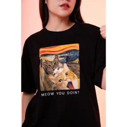 OK Apparel เสื้อยืดคอกลม ลายแมวว้าว ทรง oversize Cotton USA พร้อมส่ง